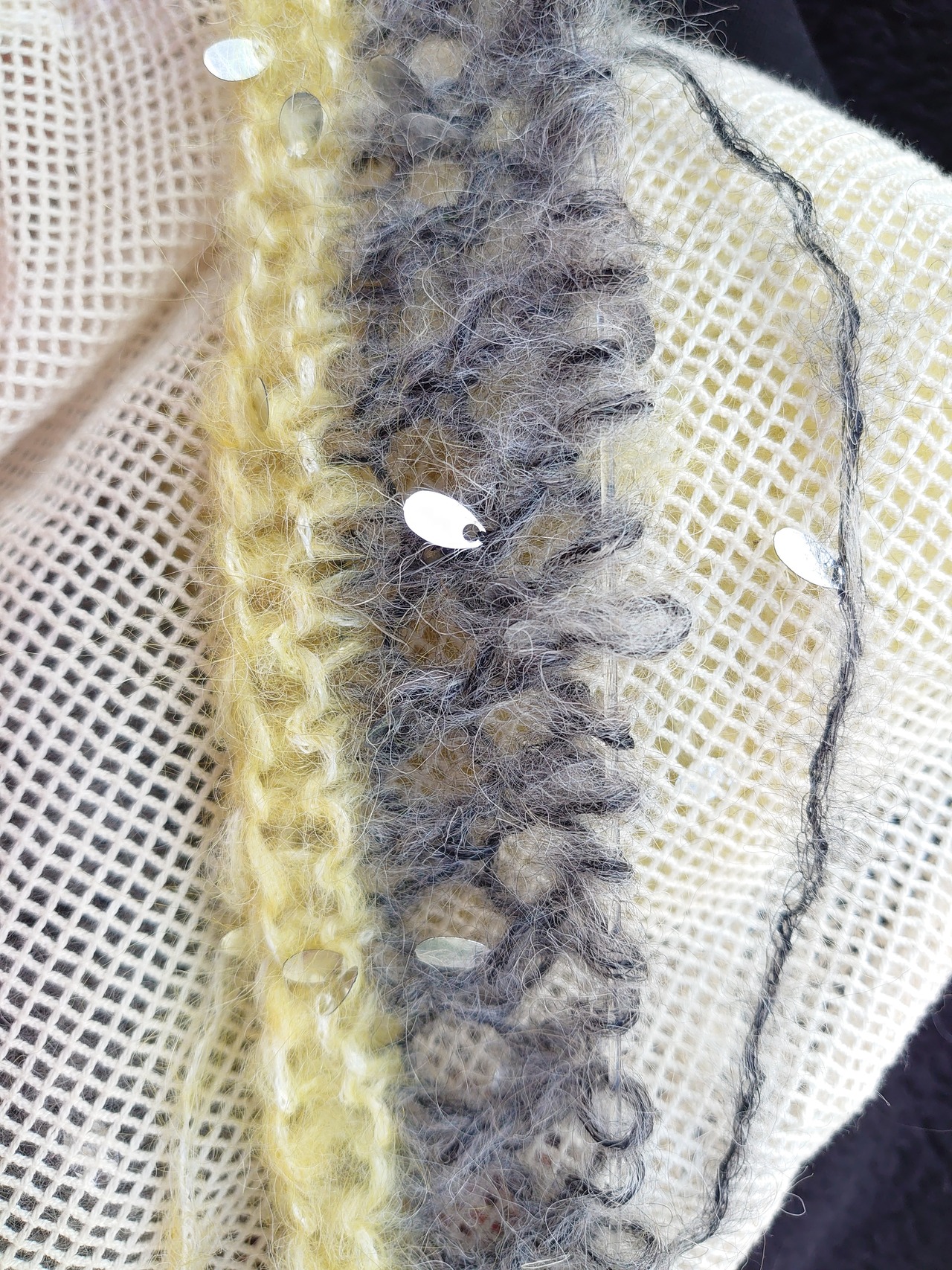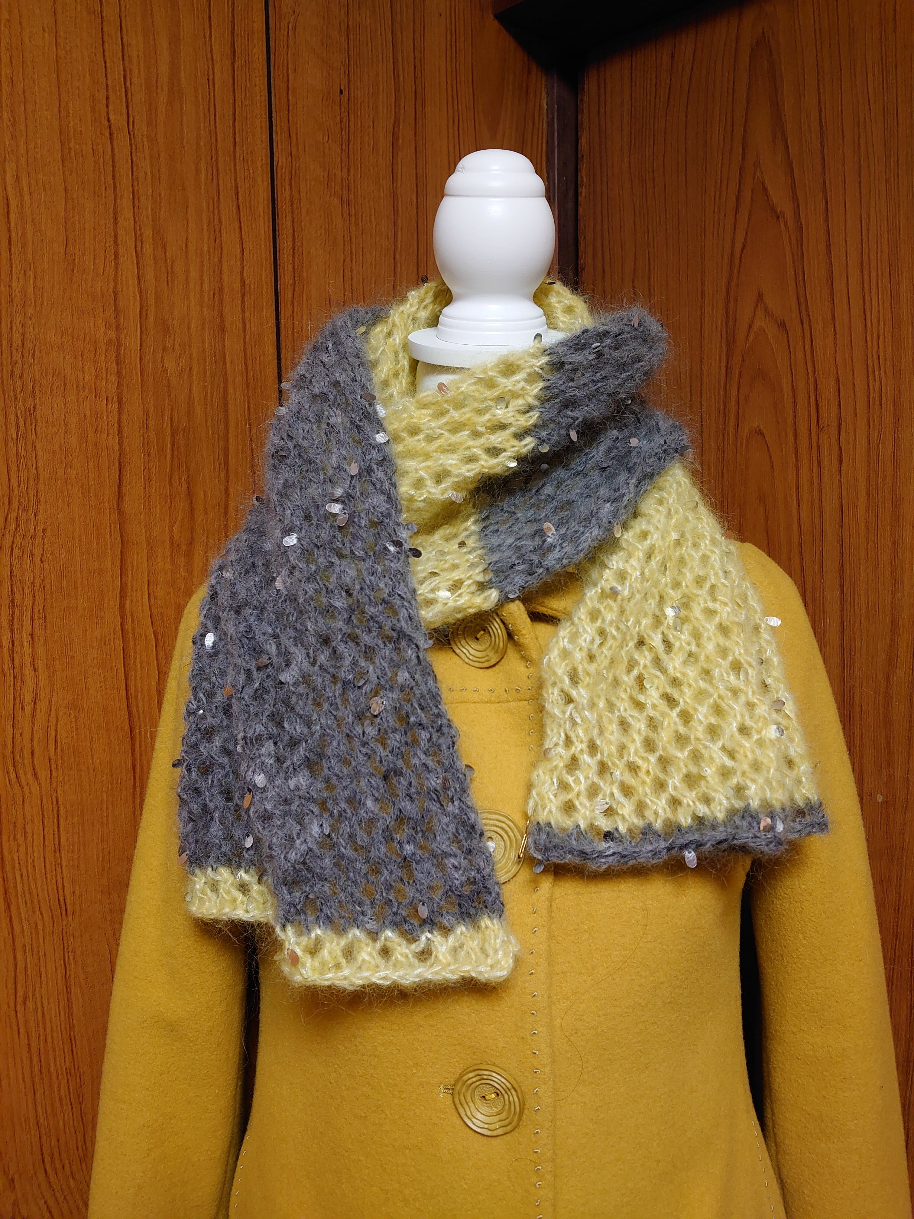 スーパーファインアルパカとキッドモヘアを使ったふわふわ糸に、ドロップ型のスパンコールが散りばめられた、ふわふわキラキラなマフラーです。