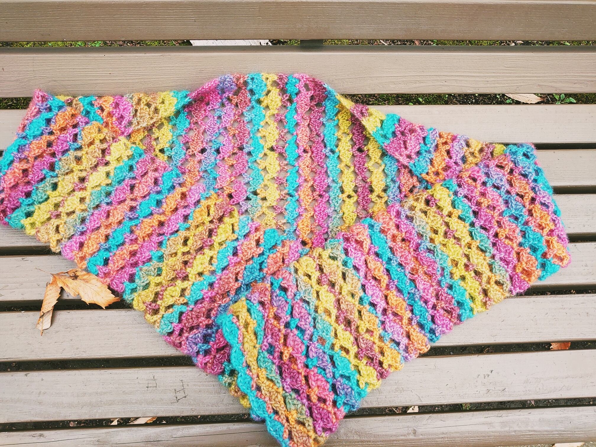 モヘアに光沢のあるナイロンを組み合わせた、ふわふわキラキラな毛糸で編んだマフラー。