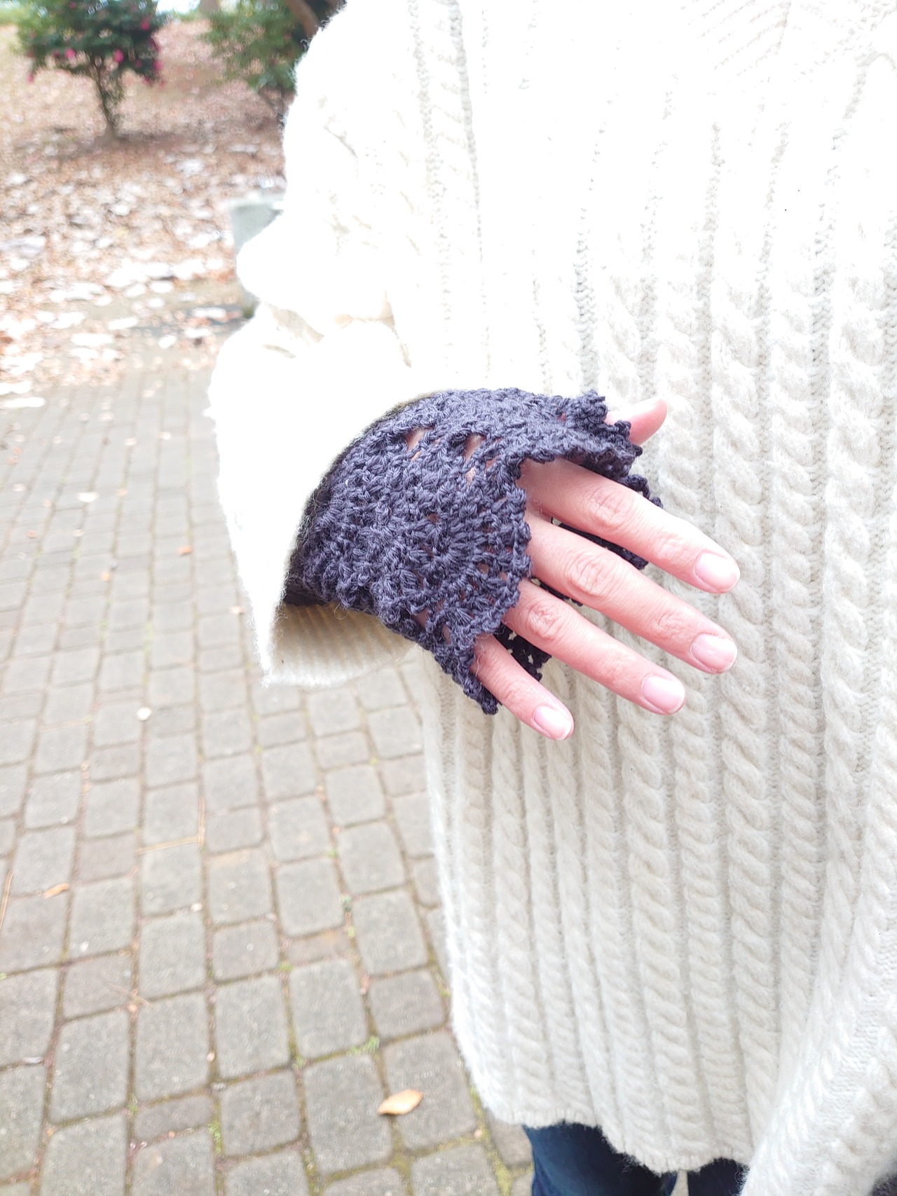 やわらかなメリノウール混紡の毛糸で編んだ、レーシーなハンドウォーマー。
